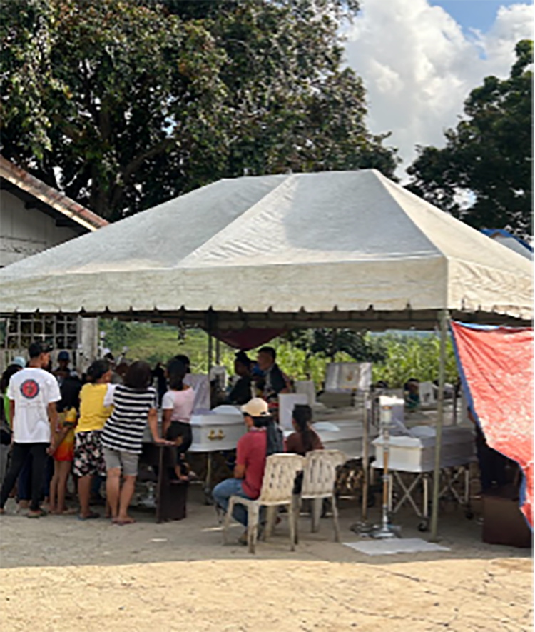 Some survivors are in temporary shelters set up in open fields. Furthermore, due to the earthquake and subsequent power outage, water supply is suspended in Bogo City, leading to a shortage of drinking water.