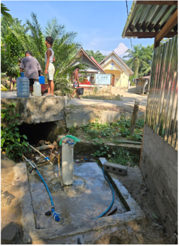 湧き水を引いて一帯の住民へ配管設置を進めています。警察機動隊(Korps Brimob: The Mobile Brigade Corps) との連携により、深さ20〜30mが必要な井戸の掘削が可能となりました。また、各地区のキーパーソンなどから情報収集を行い、支援先の選定につなげました。
