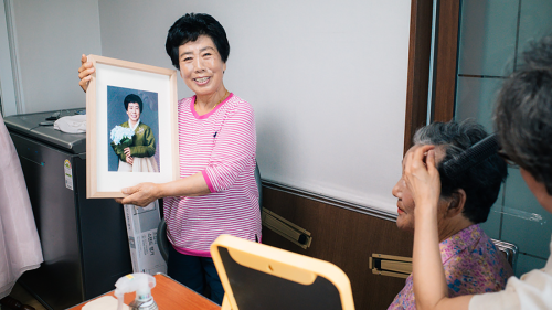 上記の状況を受けて、写真を通じて被災者の心理的・情緒的な回復を助けるプロジェクトを実施。地域のボランティア(元美容師の住民など)の協力を得て、高齢者の方々にメイクを施し、色鮮やかな韓服(ハンボク)を着用してもらい、プロの写真家が撮影を担当。画像修正技術も使い、参加者が自信を持って笑えるようサポートしました。