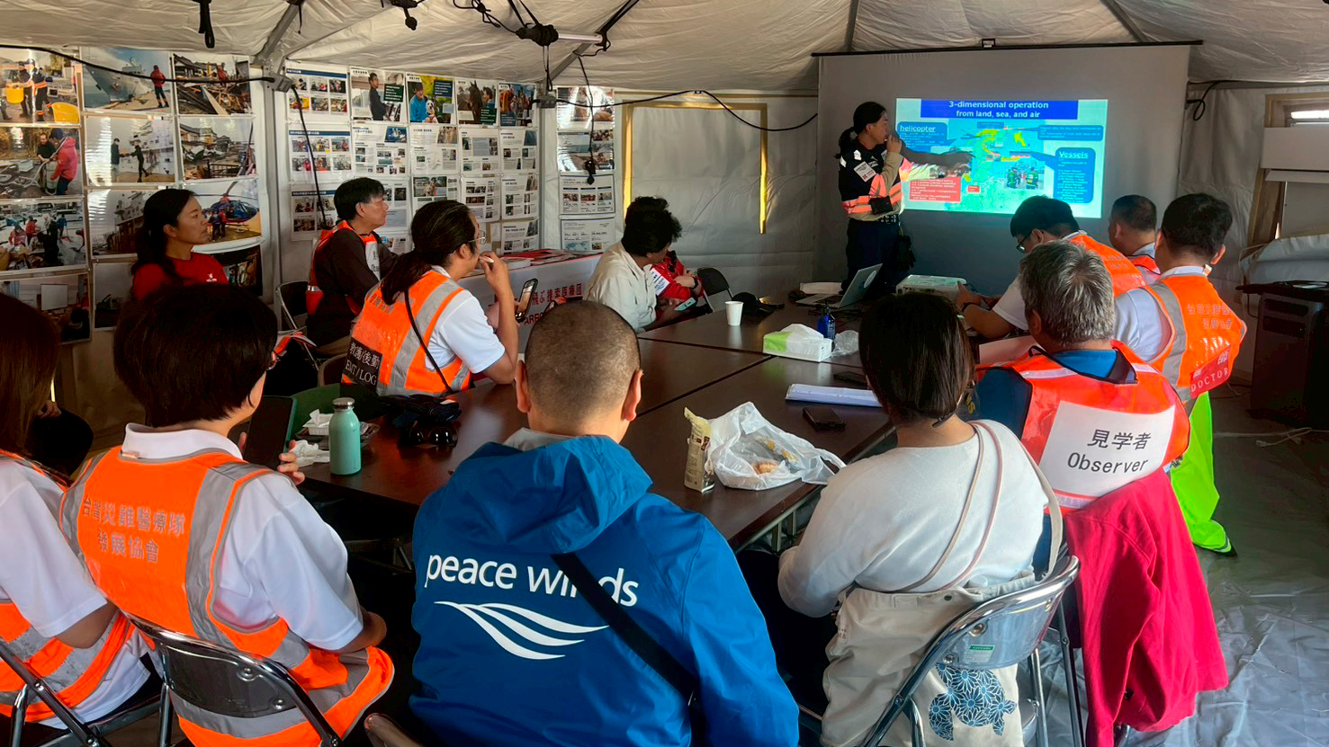The first day began with a briefing session where the participants learned about procedures for accepting overseas medical teams during a disaster and ARROWS’ activities. The main training started in the afternoon, simulating support for a massive disaster with overseas teams and external aid organizations carrying out relief activities.